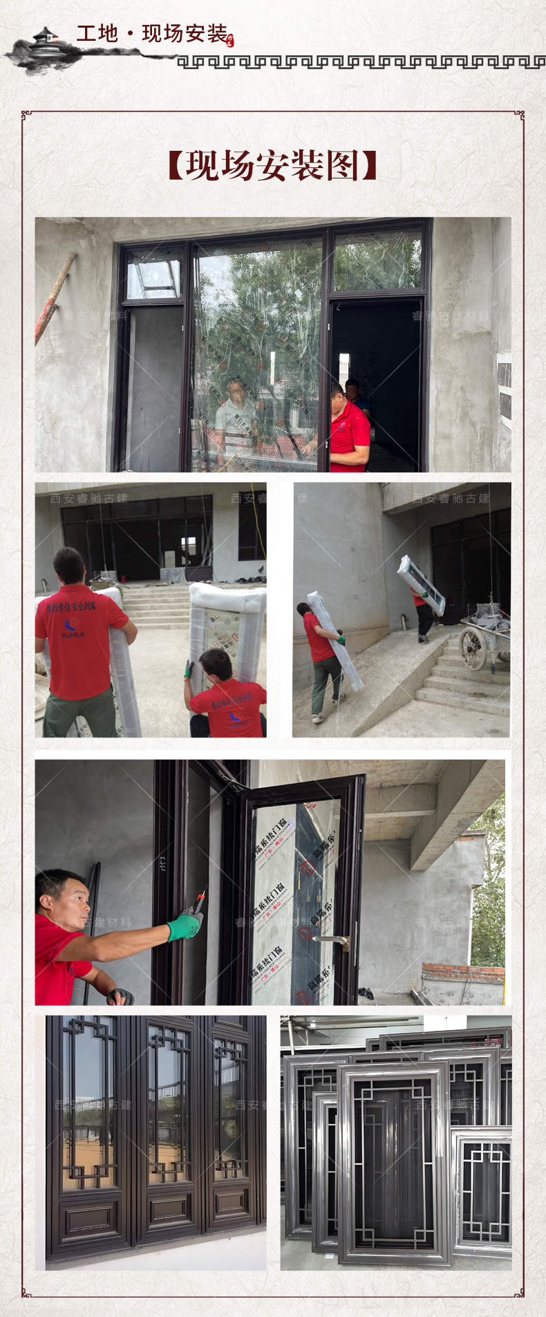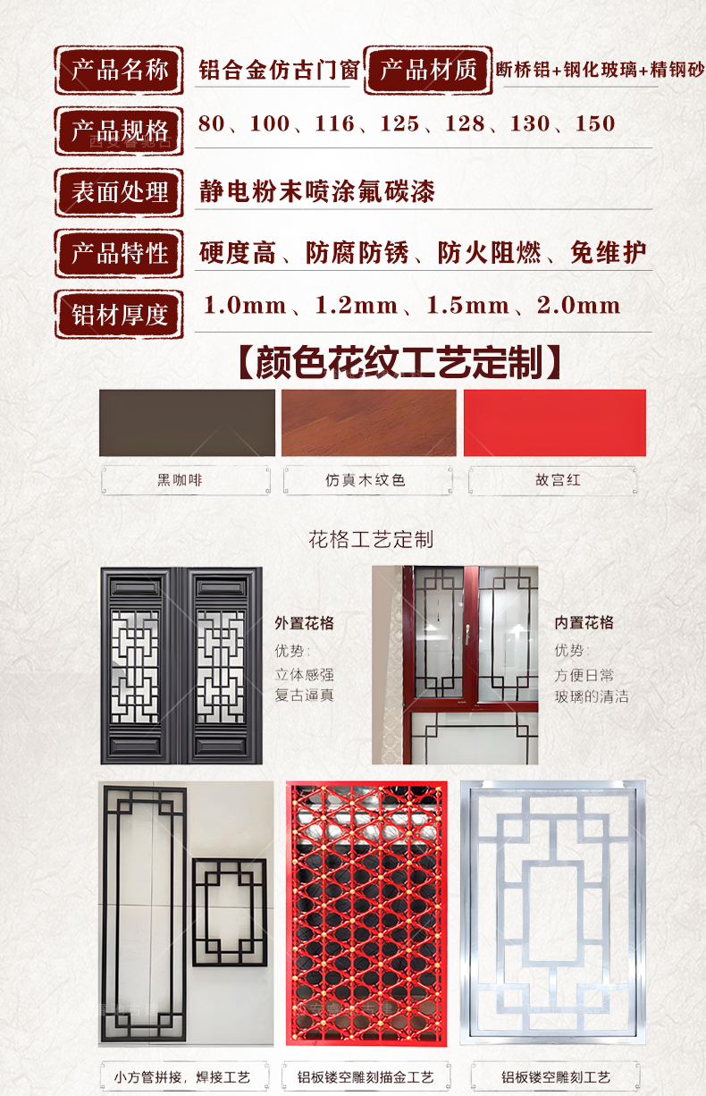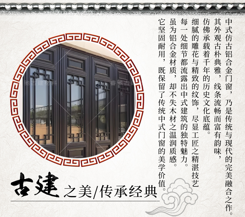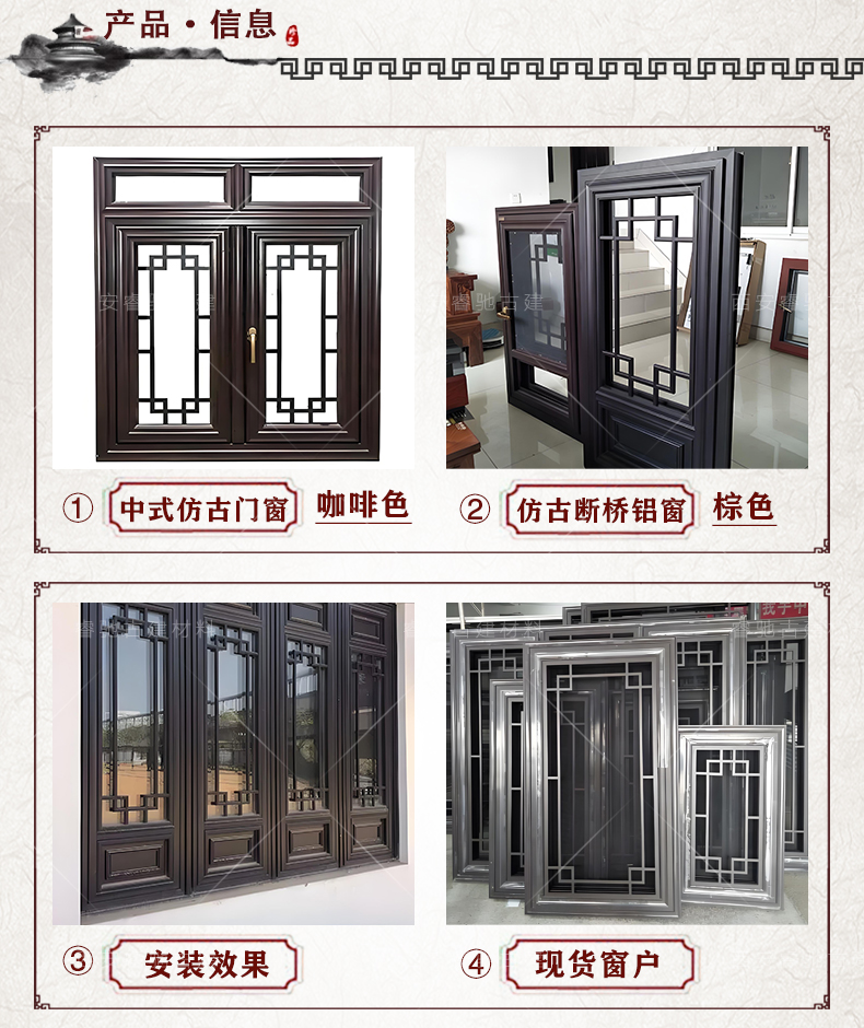 铝合金仿古门窗式一种高端用于:仿古建筑,苏轼园林,古建修缮的门窗,材料选用隔热性好的断桥铝为主材,搭配5mm中空钢化玻璃,表…
