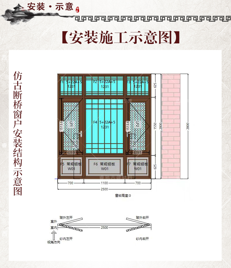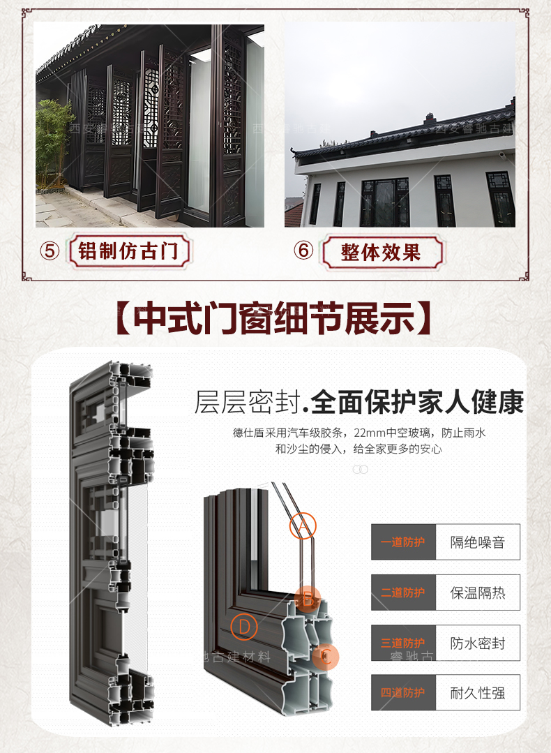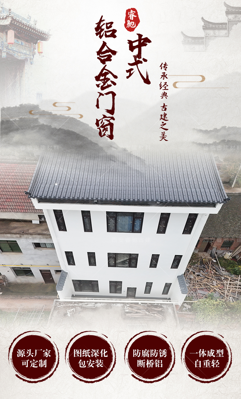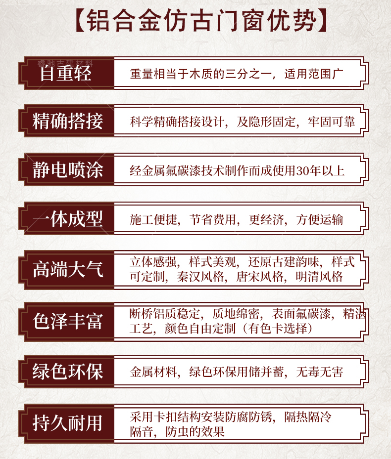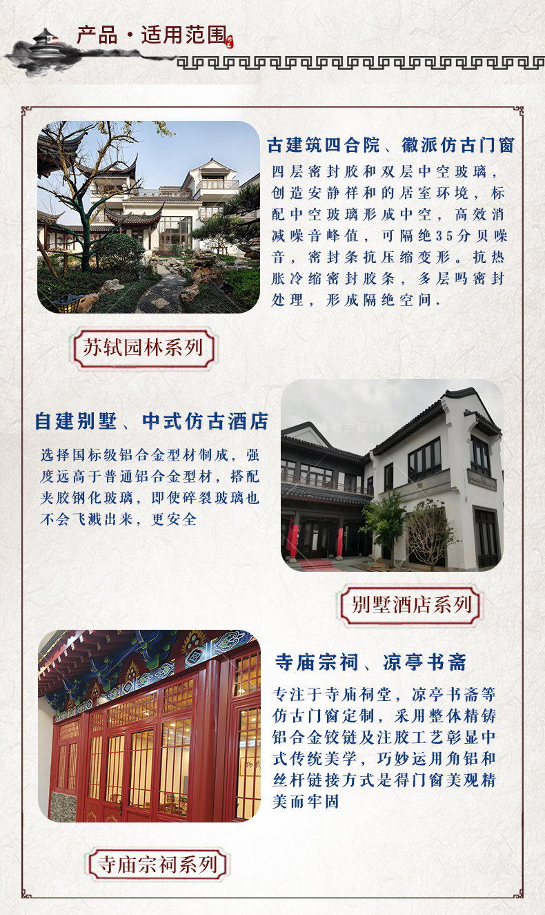 铝合金仿古门窗式一种高端用于:仿古建筑,苏轼园林,古建修缮的门窗,材料选用隔热性好的断桥铝为主材,搭配5mm中空钢化玻璃,表…
